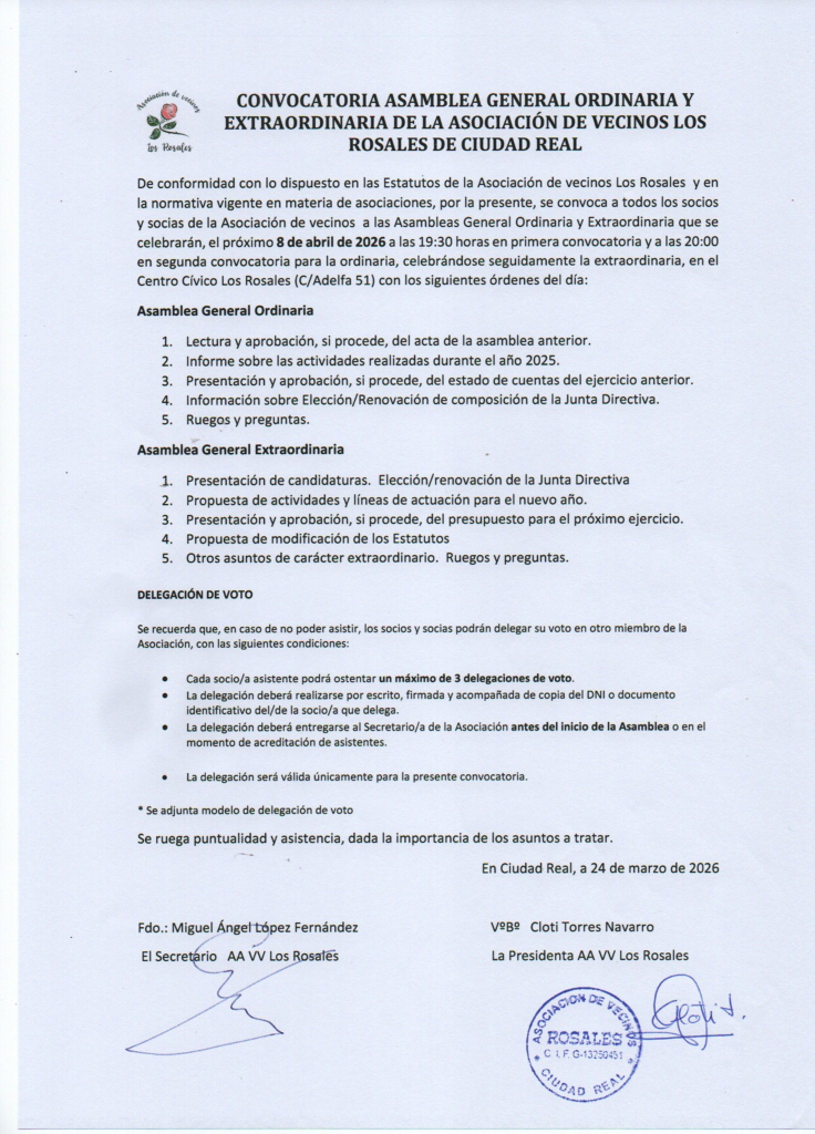 Asamblea general ordinaria y extraordinaria de la Asociación de Vecinos LOS ROSALES de Ciudad Real